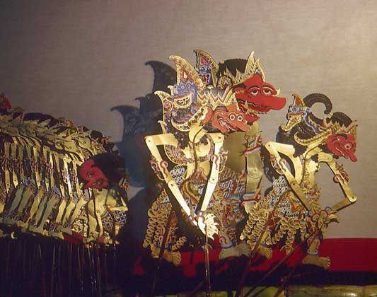 В театре, также называемом Ваянг (Wayang), используются марионетки, прикрепленные к стержнями и перемещаемые в затемненной комнате за освещаемым экраном. Кукольный театр теней существует очень давно, его история занимает важное место в истории Индонезии, ссылаясь на записи, относящиеся к 930 году нашей эры.