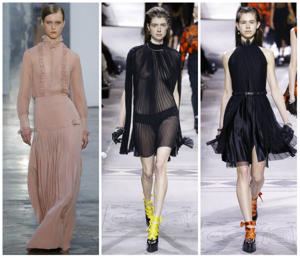 Не покидает подиум и бесконечный символ женственности — кружево. Цветочные и абстрактные кружевные орнаменты представлены во многих коллекциях: Nina Ricci, Reem Acra, Alice+Olivia, Elie Saab, Badgley Mischka. Помимо кружева мировые дизайнеры предлагают подчёркивать силу слабого пола рюшами.