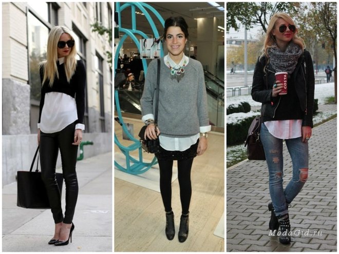 Со свитером. Воротничок, манжеты, полы выступают из-под свитера в качестве декоративных элементов.