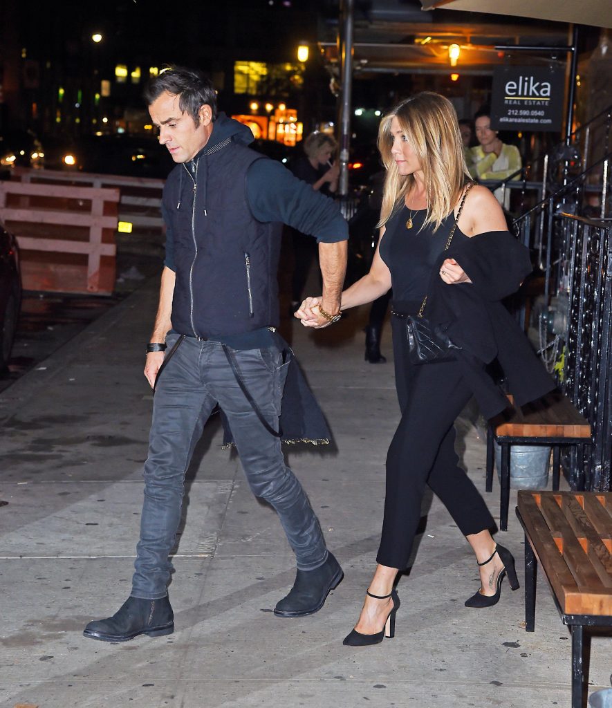 MANHATTAN, NY — SEPTEMBER 24, 2016: Jennifer Aniston and Justin Theroux step out for the first time since Angelina Jolie and Brad Pitt split, as they get dinner with friend Carlos Quirarte with his wife on SEPTEMBER 24, 2016 in New York