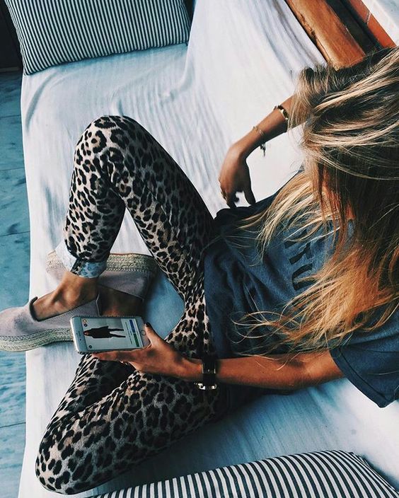 Леопардовые лосины отлично сочетаются с белыми футболками, майками, а также верхом спокойных нейтральных цветом. Аксессуары выбирайте сдержанные для более классического образа и яркие для праздника. Чтобы не выглядеть вульгарно, аккуратно сочетайте леопардовые лосины и золото.