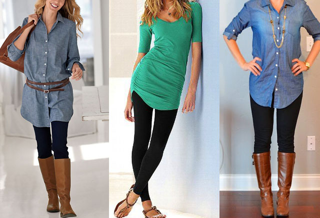 Советы: прекрасно смотрятся леггинсы с джинсовым платьем, а также платьем — рубашкой. Обратите внимание на выражение себя в платье — рубашке и лосинах, это очень современно и стильно.
